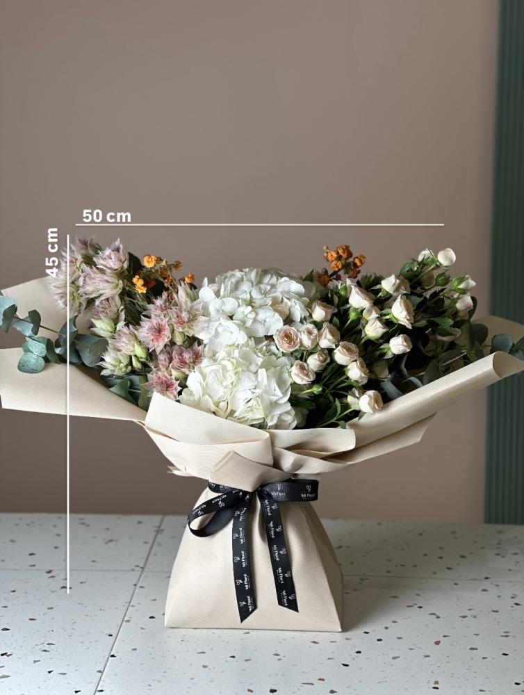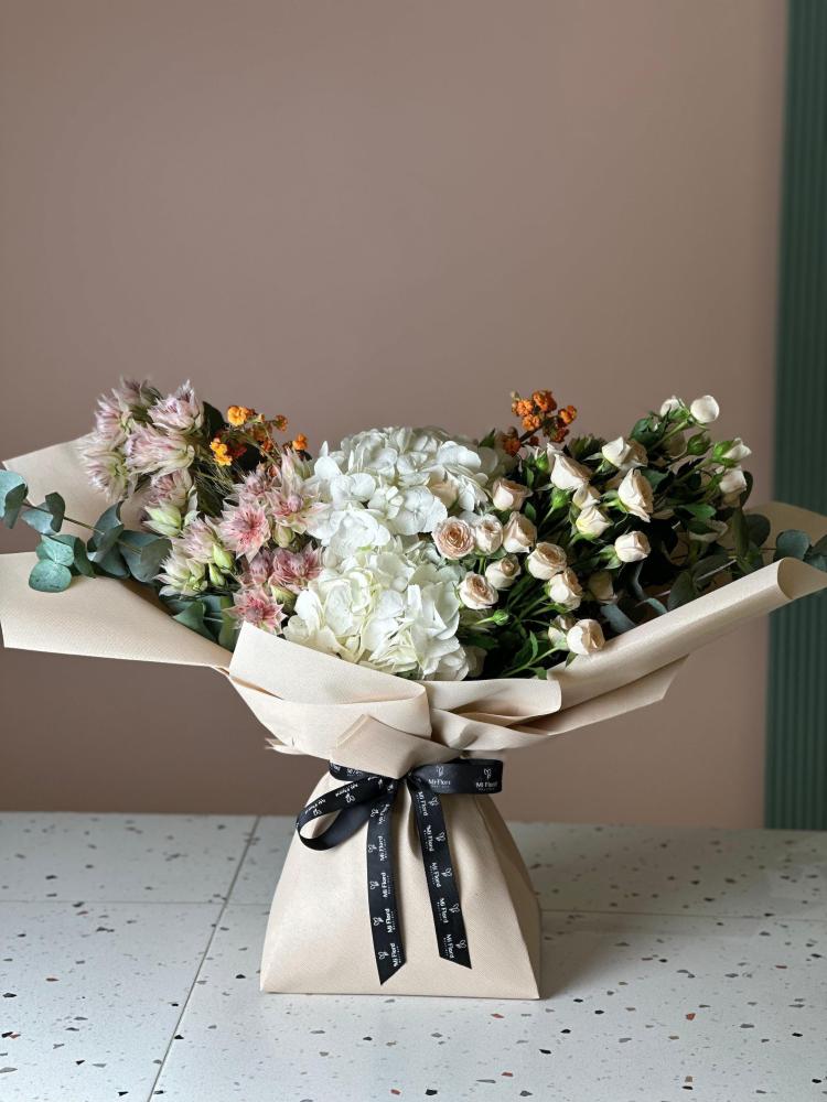 باقة زهور طبيعيه منسقه من زهور الهايدرنجا و البيبي روز بالإضافه إلى البلشينج برايد و الكالانشو مع أغصان اليوكالبتوس الخضراء