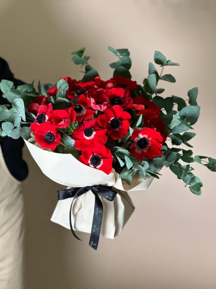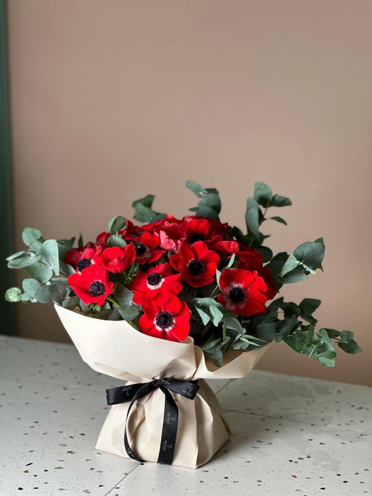 باقة زهور طبيعيه من ٢٠ غصن من زهور الأنيموني و ٥ أغصان يوكالبتوس